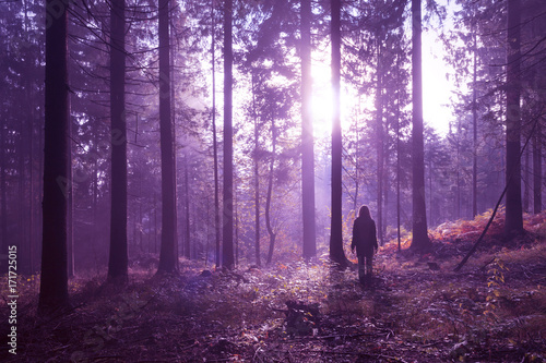 © robsonphoto, Fototapeta premium Kobiety pozycja w magicznych purpurach barwił mgłowego głębokiego las z światłem słonecznym.