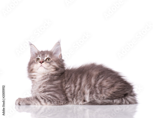 Obraz premium Kociak Maine Coon w wieku 2 miesięcy. Kot na białym tle. Portret piękny domowy szary kotek.
