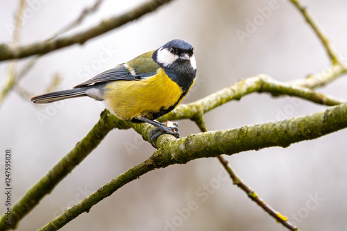 Fototapeta premium Kohlmeise mit Futter im Winter auf einem Ast / Vogel