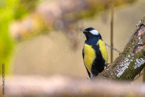 Fototapeta premium Kohlmeise mit Futter im Winter auf einem Ast / Vogel