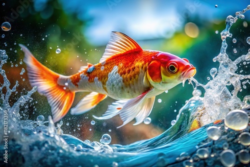© Sandra, Fototapeta premium Koi fish, water droplets, vibrant colors, a double exposure, close-up.