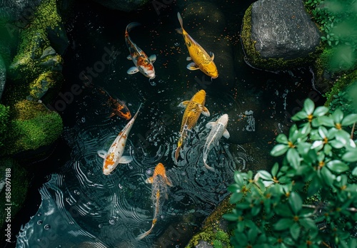 Fototapeta premium Koi fishes swimming in a koi fishpond, scenic view, peaceful state, created...