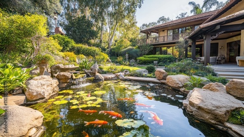 © Biancaart, Obraz premium Koi Pond and Waterfall Feature in Lush Backyard Garden