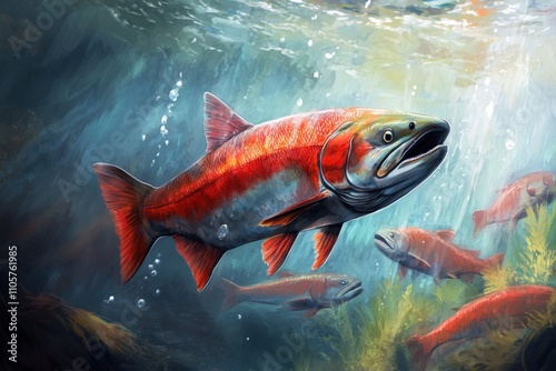 Fototapeta premium Kokanee Salmon Spawning Underwater: Wild Fish Swim in Red River Nature