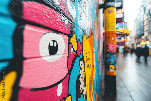 © Yurii Levko, Naklejka premium Kolorowa sztuka uliczna zdobiąca ścianę w Londynie, w tle widać rozmazanych ludzi spacerujących