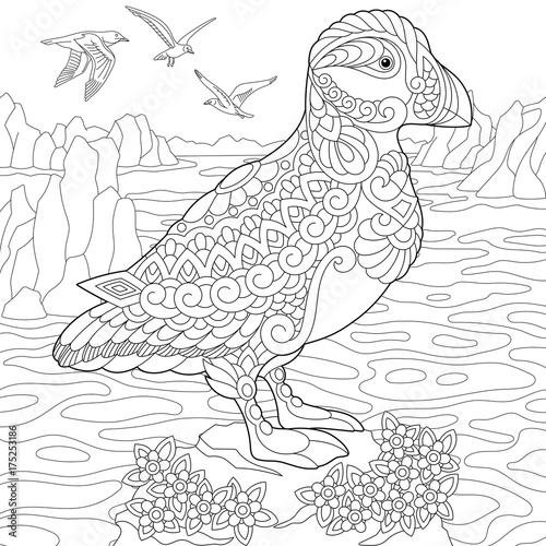 © Sybirko, Obraz premium Kolorowanka maskonura, ptaka morskiego wód północnych i arktycznych. Szkic odręczny rysunek dla dorosłych kolorowanka antystresowy w stylu zentangle.