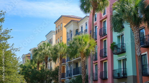 © Sawyer0, Naklejka premium Kolorowe budynki w szeregu z balkonami, przed którymi rosną drzewa, wprowadzają radosny akcent do przestrzeni miejskiej.
