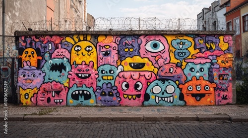 © khumthong, Naklejka premium Kolorowe graffiti potworów na miejskiej ścianie Zabawne postacie z kreskówek Sztuka uliczna