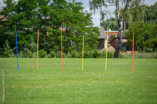 Fototapeta premium Kolorowe słupki sportowe na boisku