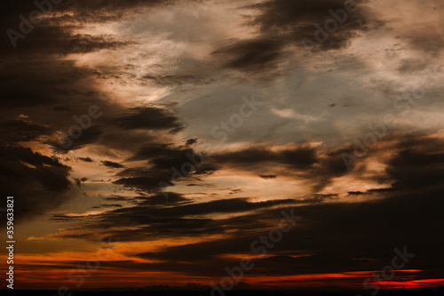© Nomad Pixel, Fototapeta premium Kolorowe zachmurzone niebo o zachodzie słońca. Niebo tekstury, streszczenie tło natura