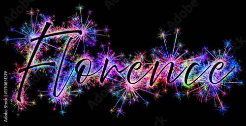 © Blue Pixel, Obraz premium Kolorowe zimne ognie i fajerwerki układające się w kształt nazwy miasta Florencja we Włoszech.