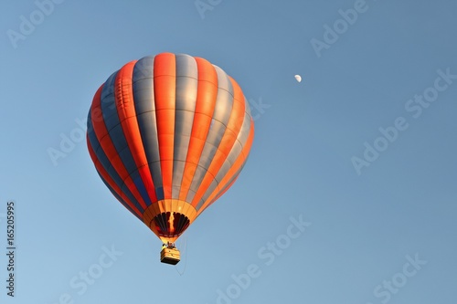 © montypeter, Naklejka premium Kolorowy balon leci o zachodzie słońca. Naturalne kolorowe tło z nieba i księżyca