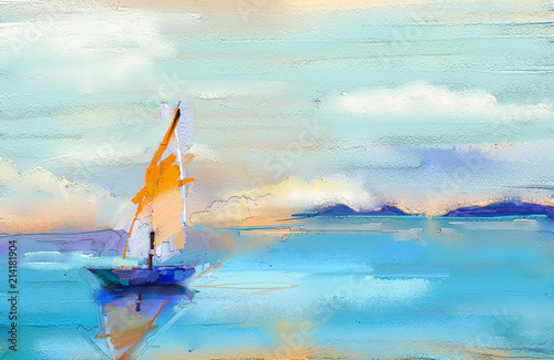 © nongkran_ch, Naklejka premium Kolorowy obraz olejny na płótnie tekstury. Impresjonizm obraz pejzaży z tłem światła słonecznego. Obrazy olejne współczesnej sztuki z łodzią, pływają po morzu. Abstrakcyjna sztuka współczesna na tle