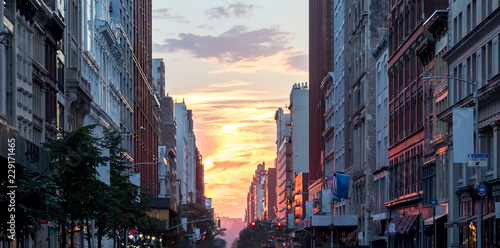 © deberarr, Fototapeta premium Kolorowy zachód słońca między budynkami Manhattanu w Nowym Jorku