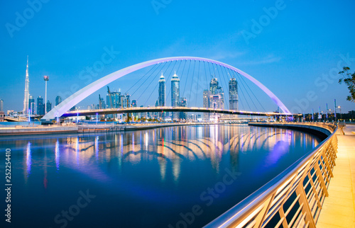 Naklejka premium kolorowy zachód słońca nad drapaczami chmur w centrum Dubaju i nowo wybudowanym mostem Tolerance, patrząc z kanału wodnego w Dubaju