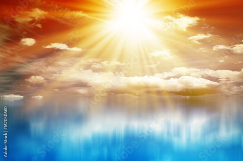 Fototapeta premium Kolorowy zachód słońca. Niebo z chmurami i słońcem nad błękitnym morzem