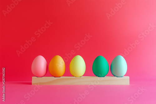 © Silent26, Fototapeta premium 5 kolorowych pomalowanych jajek na różowym tle
