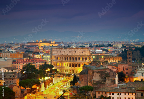 Obraz premium Koloseum w Rzymie po zachodzie słońca z citylightami