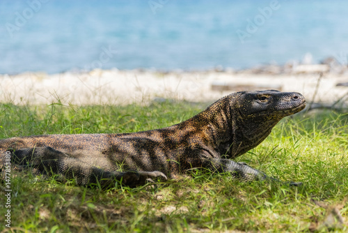 Fototapeta premium Komodo dragon chilling in the green grass at Komodo island Indonesia