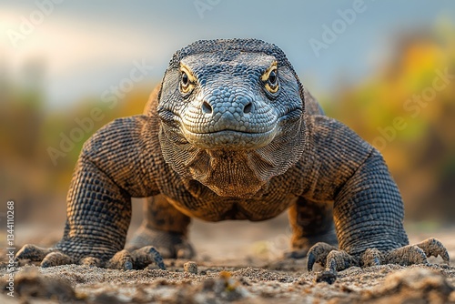 Obraz premium Komodo dragon facing camera, Indonesian island, sunset, wildlife documentary