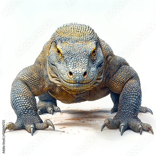 © CHAIYAPHON, Obraz premium Komodo dragon on the ground, in full front view, against a white background