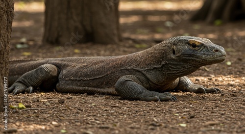 © Timur, Obraz premium Komodo dragon resting on forest floor in Indonesia