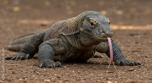 Obraz premium Komodo Dragon with Tongue Out Exploring its Habitat with Curiosity