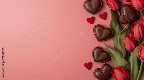 © Sawyer0, Naklejka premium Kompozycja Walentynkowa z czekoladkami w kształcie serc i czerwonymi tulipanami, ułożona na delikatnym tle z przestrzenią na tekst lub projekt.