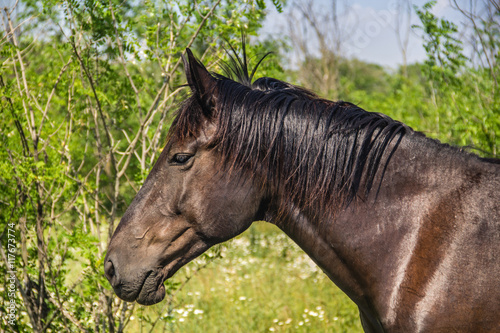 Fototapeta premium Koń na makro pastwisk, kraj lato krajobraz