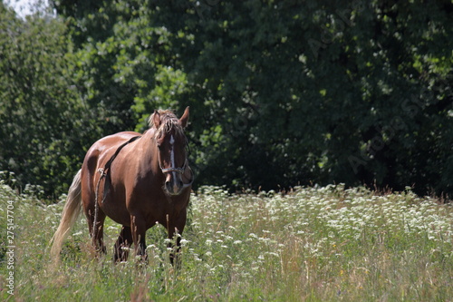 © f2014vad, Fototapeta premium Koń pasący się na łące z wysoką zieloną trawą.