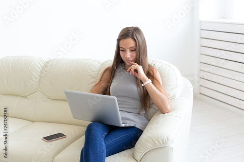 © satura_, Fototapeta premium Koncepcja niezależnych i osób - młoda kobieta siedzi na kanapie i pracuje na laptopie