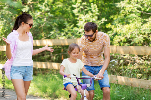 © Syda Productions, Fototapeta premium koncepcja rodziny, rodzicielstwa, wypoczynku i ludzi - szczęśliwa matka, ojciec i córeczka uczą się jeździć na rowerze w letnim parku