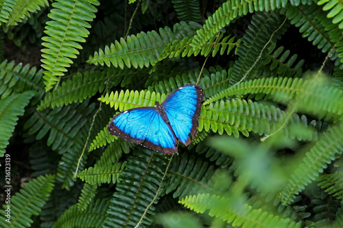 © mylasa, Fototapeta premium Konya Tropikal kelebek bahçesinde kanatlarını açmış mavi renkli bir kelebek ( Morpho peleides )