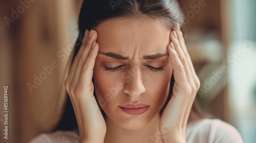 Obraz premium Kopfschmerzen Person hält Kopf mit Händen Schmerz erkennbarer Gesichtsausdruck für Migräne Generative AI