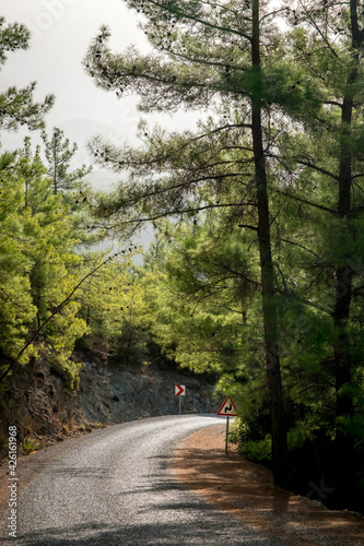 Fototapeta premium Koprulu Canyon National Park. A winding forest road surrounded by pine trees....