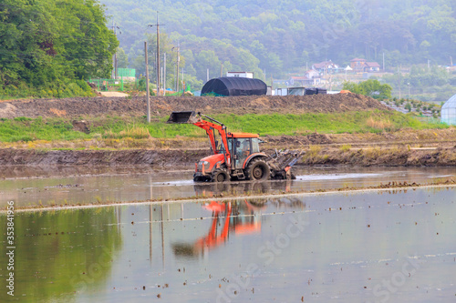 Fototapeta premium Korean traditional rice farming. Korean rice farming scenery. Korean rice paddies. Korea planting preparation work.