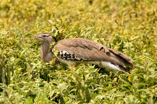 © Edwin, Fototapeta premium Kori bird walking in a green field in Ndutu Tanzania