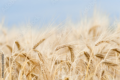 Fototapeta premium Kornfeld im Detail unter blauem Himmel