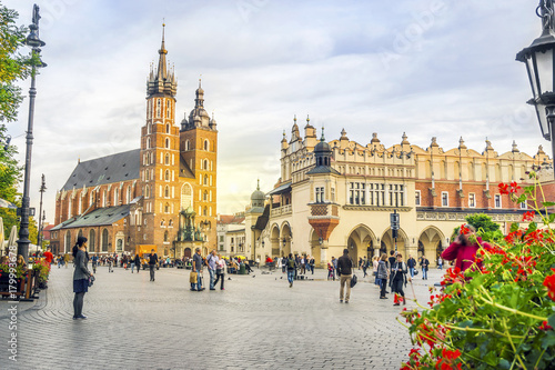 © eunikas, Fototapeta premium Kościół Mariacki i Sukiennice przy zachodzie słońca, Kraków, Polska