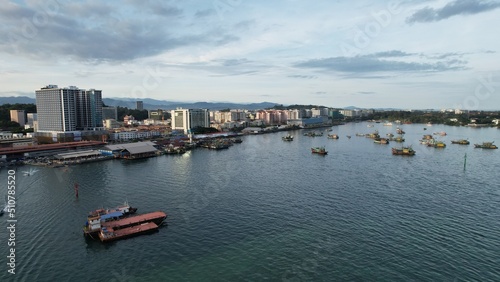 © Aerial Drone Master, Fototapeta premium Kota Kinabalu, Sabah Malaysia – June 14, 2022: The Waterfront and Esplanade Area of Kota Kinabalu City Centre