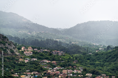 Fototapeta premium Kotor Skurda canyon cliff mountains by old fort fortress trail hike in rain...