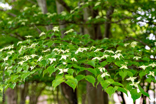 © Kazu, Obraz premium Kousa Dogwood (Benthamidia japonica syn. Cornus kousa) in full blooming in Japan