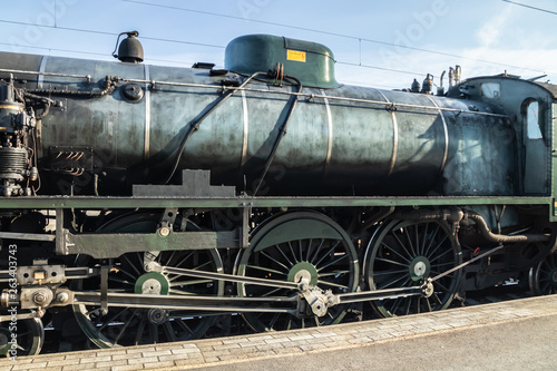 Naklejka premium Kouvola, Finland - April 18, 2019: Old steam train Ukko-Pekka on the station at morning.