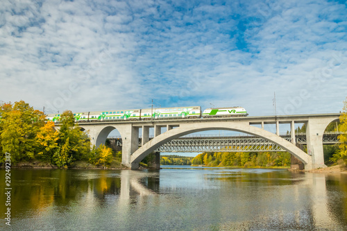 © Elena Noeva, Naklejka premium Kouvola, Finland - 25 September, 2019: Autumn landscape of bridge with moving passenger train and Kymijoki river waters in Finland, Kymenlaakso, Kouvola, Koria