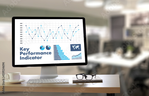 © onephoto, Naklejka premium KPI acronym (Key Performance Indicator) Business team hands at work with financial reports and a laptop