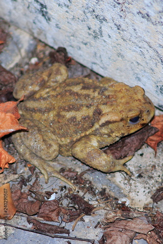 Fototapeta premium Kröte, gemeine Erdkröte sitzt an ängstlich an einer Stein Mauer im Laub