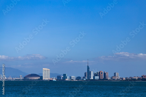 © Tetsuya, Naklejka premium Krajobraz i zabytki miasta Fukuoka, wieża Fukuoka i kopuła Fukuoka nad oceanem.
