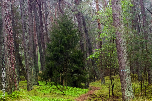 © Monika, Fototapeta premium Krajobraz leśny pnie drzew