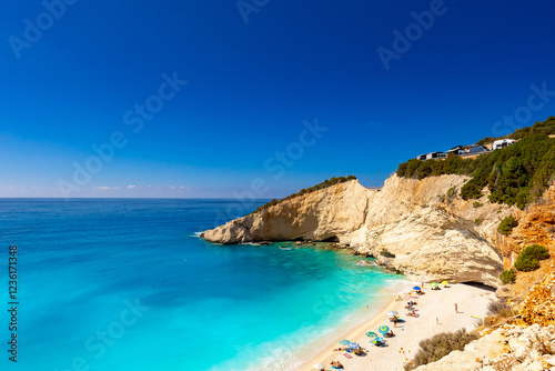 Naklejka premium Krajobraz letni, grecka wyspa Lefkada, niebieski kolor, relaks i wypoczynek,...