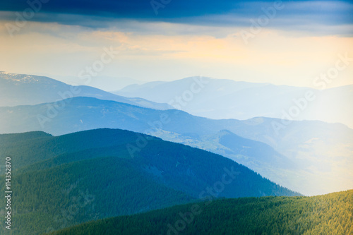 © vovik_mar, Fototapeta premium Krajobraz mglistych górskich wzgórz na odległość.